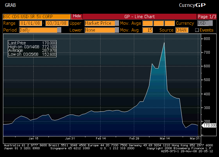 This is the chart of Bear Stearns’s CDS. Note that the price started climbing steeply in late February.The first Times article about Bear Stearns’s troubles was published on March 11, referring to the plunge in the stock price the previous day.