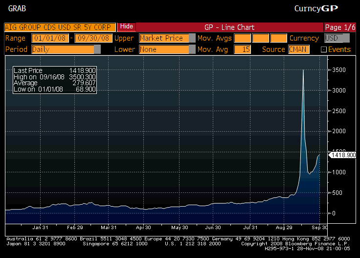 This is AIG. It looks like an instantaneous spike in mid-September, but the price had been climbing steadily, from double digits in May to 300 bp in mid-August to 430 bp on September 4. The first Times article appeared on September 12, again describing events on September 11. By September 10, however, CDS spreads were already up to 517 bp.