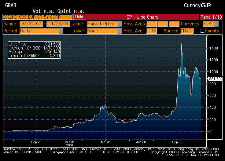 And this is Iceland. In the middle of 2007, Iceland’s CDS were priced below 10 bp. They spent most of July and August this year in the high 200s, passed 300 in mid-September, and reached 395 bp on Friday, September 26. Iceland only reached the attention of the mainstream media on Monday, September 29 (Times article the next day, in which Iceland barely got a mention).