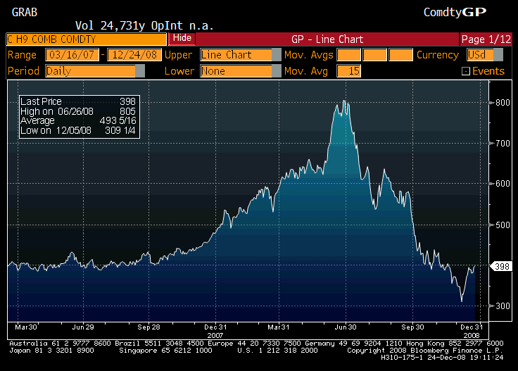 1. Food prices. The run-up in food prices earlier this year threatened hundreds of millions of people with malnutrition or starvation. These are March 2009 corn futures: