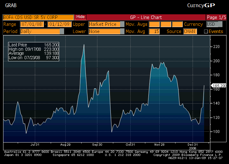 On the minus side, CDS spreads have shot up on Citigroup and Bank of America in the last week – here’s Bank of America: