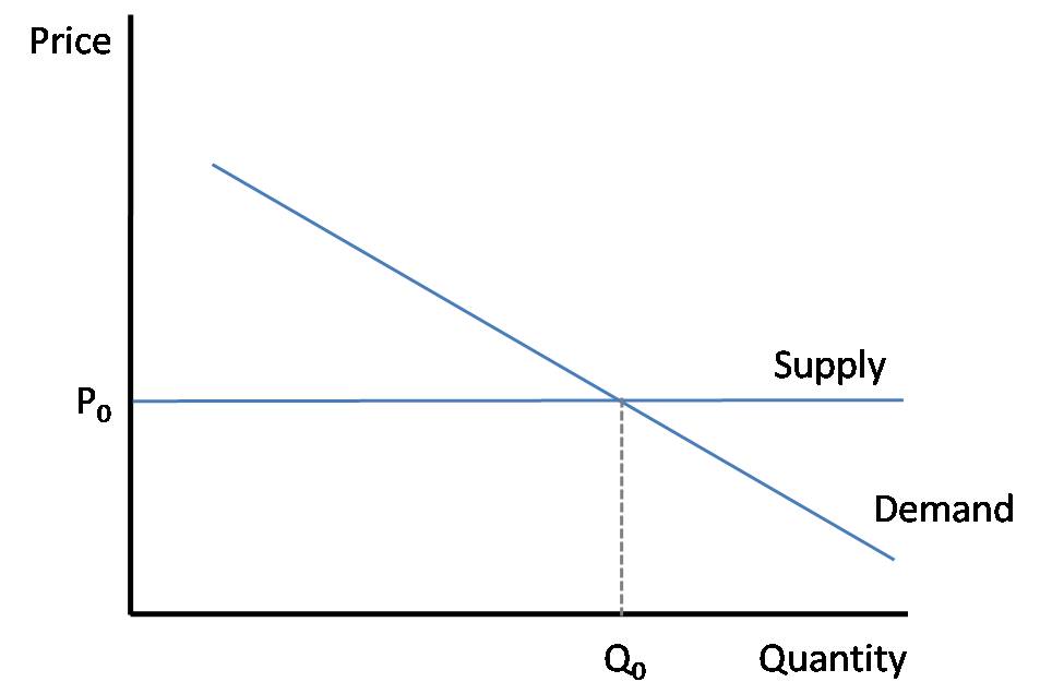 The argument that higher fuel efficiency standards reduces jobs goes like this. The diagram below shows the market before regulation. Auto companies will supply cars at some price that includes their cost plus the profit margin they need to pay off their debts and provide a return to their shareholders. (You could draw the supply curve with an upward slope and everything that follows would be essentially the same.) The more expensive the car, the fewer people will buy it. At equilibrium, the price is P0 and Q0 cars will get produced and sold.