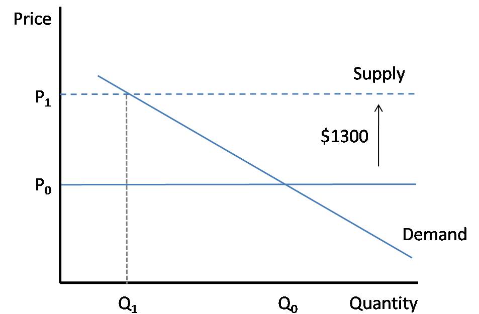 Then regulation comes along, increasing costs for car makers. The Obama people have been using the number $1300, so let’s use that number. This acts something like a tax. The price charged goes from P0 to P1, where P1 = P0 + $1300. At the higher price, fewer people will buy the car, so quantity declines to Q1. Fewer people get cars (bad) and fewer cars get produced, meaning fewer jobs in the auto industry (bad).