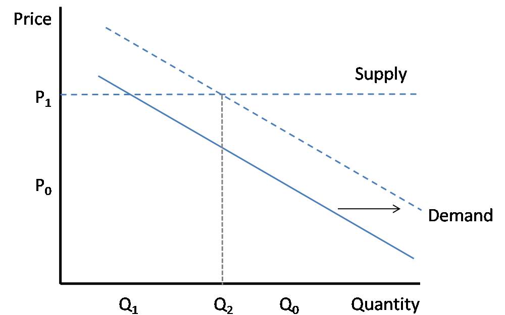However, there are two problems with this argument in its simple form. The first problem is that it isn’t the same car – now it’s more fuel efficient. That’s good, and it means that people will be willing to pay more for it. In other words, the demand curve shifts outward, so at equilibrium, quantity will be Q2, which is somewhere between Q0 and Q1. Q2 will still be less than Q0; otherwise, the free market would have come to that equilibrium by itself. (If people valued the increased fuel efficiency at $1300 or more, the industry would already have done it, at least according to a pure free-market argument.) So things are not as bad as in the picture above.