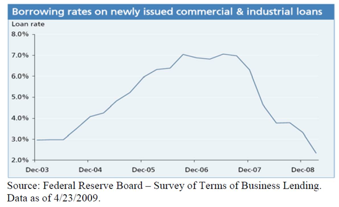 Cembalest then makes a claim that banks are lending money at lower costs: