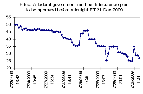 It appears that after the group of 6 announcement on July 28, the share price of the Intrade contract, “A federal government run health insurance plan to be approved before midnight ET 31 Dec 2009,” fell from around 45 to around 30, a roughly 15 point drop. This suggests the true value to these insurance companies of not having a public option may be around 6.7 (=1/.15) times the $4-5 billion change due to the announcement, or around $28-35 billion dollars.