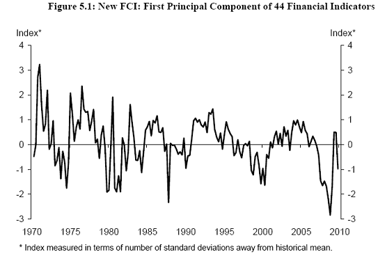 “Whereas the existing FCIs show the current level of financial conditions to be back at or slightly better than ‘normal’ levels, our index has deteriorated substantially over the past two quarters. Indeed, it has retraced nearly half of the sharp rebound that had occurred earlier in 2009. This setback suggests that financial conditions are somewhat less supportive of growth in real activity than suggested by other FCIs.”