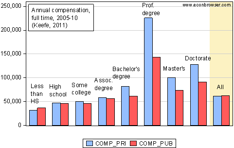 *** In case you’re wondering how public sector workers in aggregate can make more than private sector workers, even though private sector workers make more in every educational category except “less than high school,” it’s because public sector workers in aggregate are more educated than private sector workers.