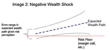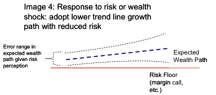 The income effect derived from the risk of falling below the red line (where utility is highly non-linear) dominates the substitution effect (the incentive to shift to higher yielding assets). Mr. Midd L. Class’s expected wealth trajectory now looks like Image 4, low yielding but safe. Mr. Midd L. Class also probably responds by reducing his overall consumption (which at the aggregate level reduces overall demand).
