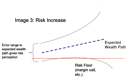 Note that this asset allocation is no longer acceptable to Mr. Midd L. Class because at some point in the future he runs the risk of dropping below the red line. Likewise, imagine that the expected wealth path remained stable but there was a sudden increase in the perceived risk of the safest of his investments (which increases the perceived risk of the entire portfolio). This might look like Image 3 below: