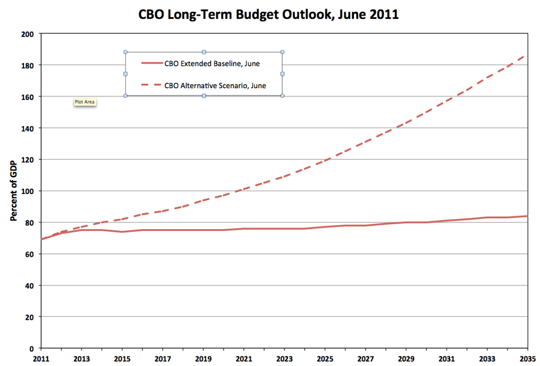 The most common source for long-term national debt scare stories is the CBO’s 2011 Long-Term Budget Outlook (LTBO), published in June. That report has two scenarios. In the extended-baseline scenario, which is pretty close to current law, the national debt reaches 76% of GDP in 2021 and 84% in 2035 (Table 1-2, p. 8)—bad, but not that bad. In the alternative fiscal scenario, which is intended to be more realistic (and which everyone cites for dramatic effect), the debt reaches 101% in 2021 and 187% in 2035—the latter being a level that virtually everyone would consider too high.
