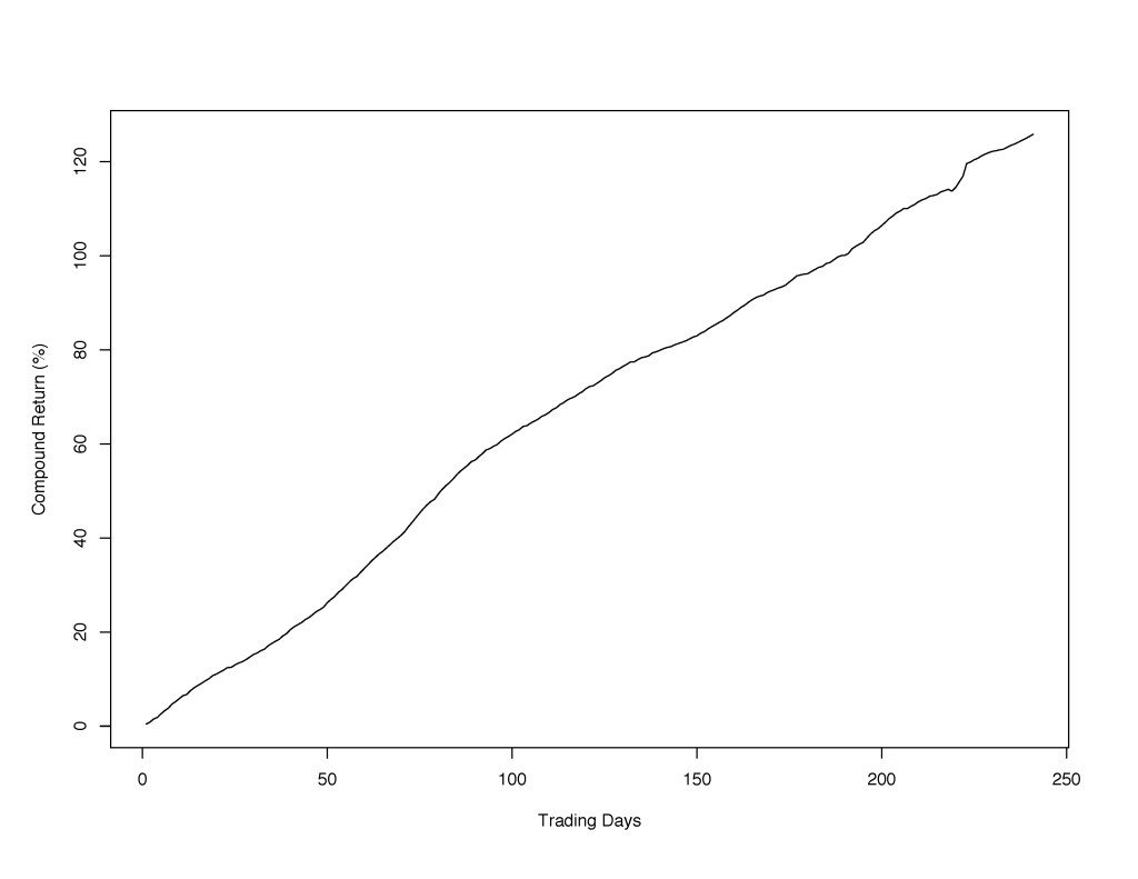 Figure 1: The compound return of a portfolio that combines long positions in stocks that decrease in value with short positions in stocks that increase in value and that is rebalanced every minute and a half.
