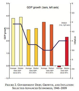 “The annual observations are grouped into four categories, according to the ratio of debt to GDP during that particular year as follows: years when debt to GDP levels were below 30 percent (low debt); years where debt/GDP was 30 to 60 percent (medium debt); 60 to 90 percent (high); and above 90 percent (very high). The bars in Figure 2 show average and median GDP growth for each of the four debt categories. Note that of the 1,186 annual observations, there are a significant number in each category, including 96 above 90 percent.”
