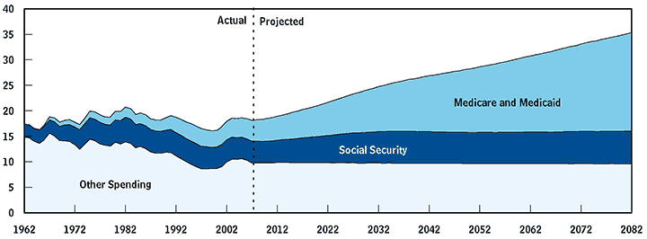 This leaves out the obvious and best solution: reduce the growth rate of health care costs. Democrats and Republicans differ on how to do it–the former put a large package of cost-cutting measures in the Senate version of the health care reform bill, the latter want to kill the tax exclusion for employer-sponsored health care (and some Democrats would be fine with that as well). But everyone knows that the long-term debt problem is a health care problem, we spend far more on health care than we get back in outcomes, and cutting health care cost growth is the key. If we don’t, then we’re completely screwed no matter how much we cut Medicare–someone has to pay those health care costs, and if we cut entitlements we’re just shifting the problem onto individuals. (Put another way, Medicare is largely a redistribution system–as Samuelson recognizes–and if you kill it, you haven’t done anything about the fundamental mismatch between aggregate income and aggregate health care costs.) You may prefer that politically, but it’s still not a solution.
